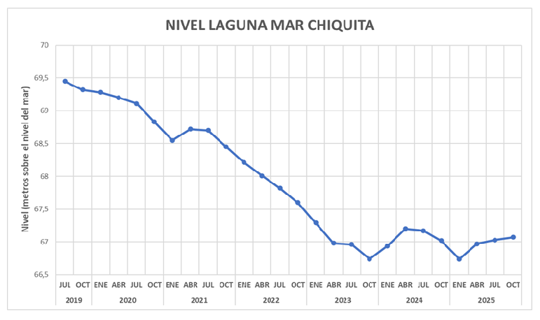 Variaciones en el nivel de Mar Chiquita desde Julio de 2019 hasta Octubre de 2024. Se advierte un constante declinio durante todo el período. Datos de la Estación Biológica Mar Chiquita (IDEA CONICET, Universidad Nacional de Córdoba)